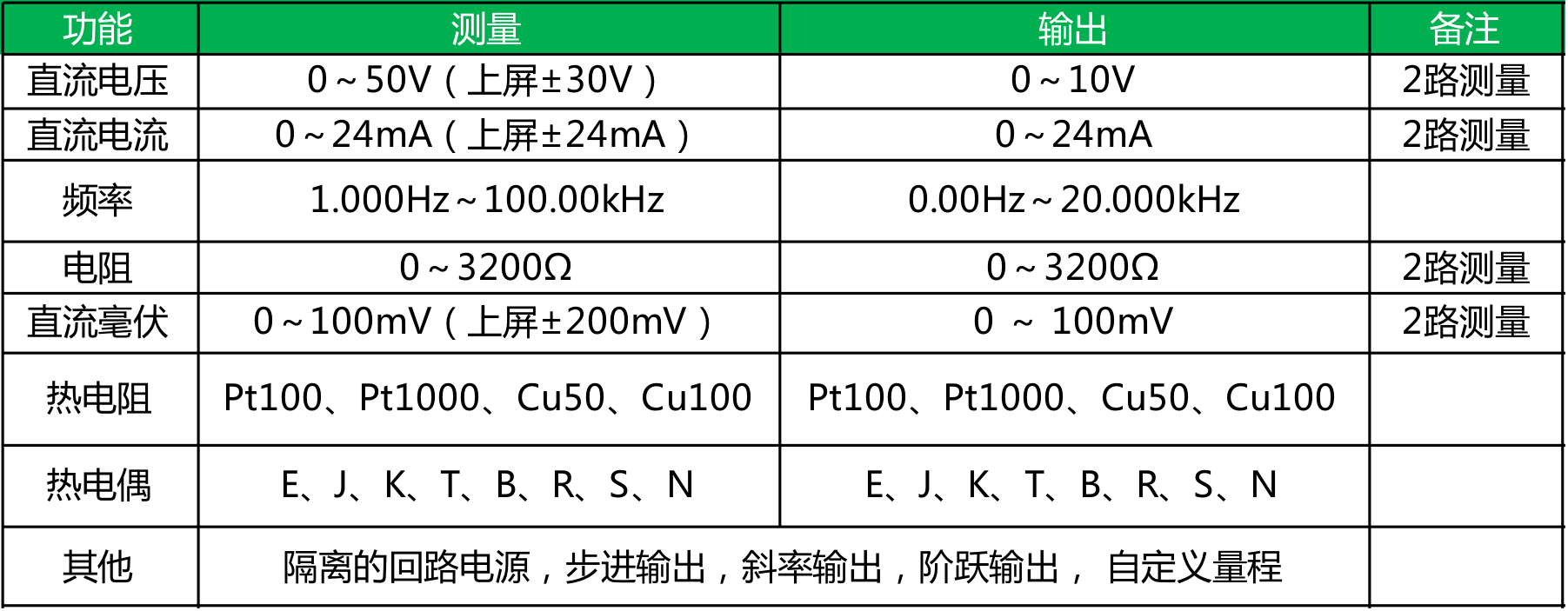 ● 测量/输出:电压、电流、频率、电阻,其中电流输出支持有源、无源;