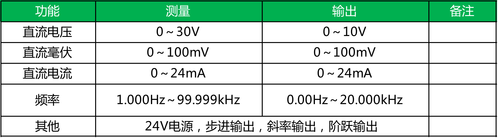 ● 测量/输出:电压、电流、频率、毫伏,其中电流输出支持有源、无源;