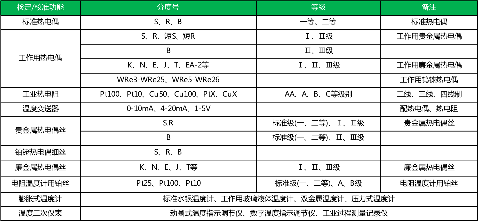 检定/校准功能一览表:
