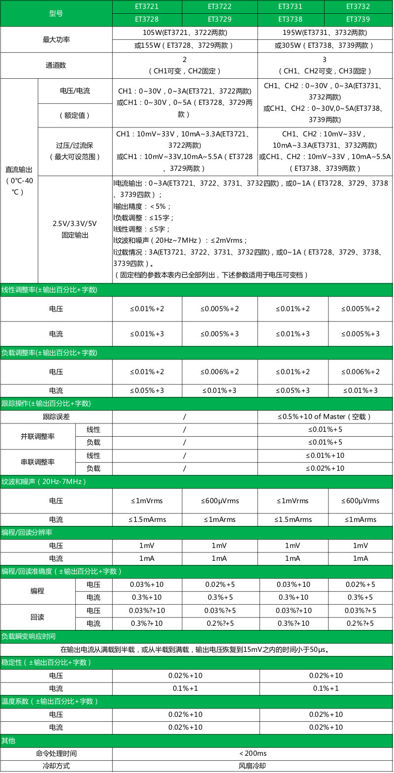 ● 独立可调输出:1路(ET372X)/2路(ET373X)可调输出30V/3A(30V/5A),1路2.5V/3.3V/5V档位可调固定输出;最大输出总功率可达305W;
